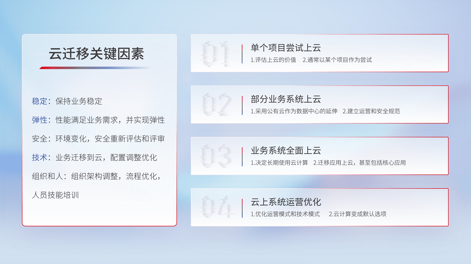 结合实际业务,,,,从规划设计、、、、云平台选型、、、、云原生改造、、、数据迁移、、集成交付,,,,迁移全过程为客户识别最佳上云路径,,,,做好风险识别管理,,,设计网络架构、、、、身份权限、、安全审计合规、、操作审计、、、日志审计、、、监控告警策略、、、多站点容灾设计等,,,,对云上基础设施进行整体规划,,,提升IT治理水平,,,以满足弹性、、高可用、、、、高性能的需求。。。。